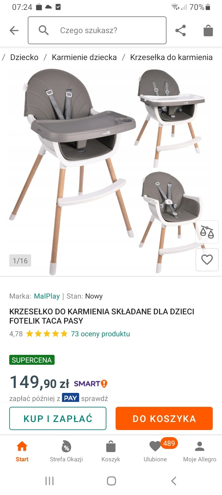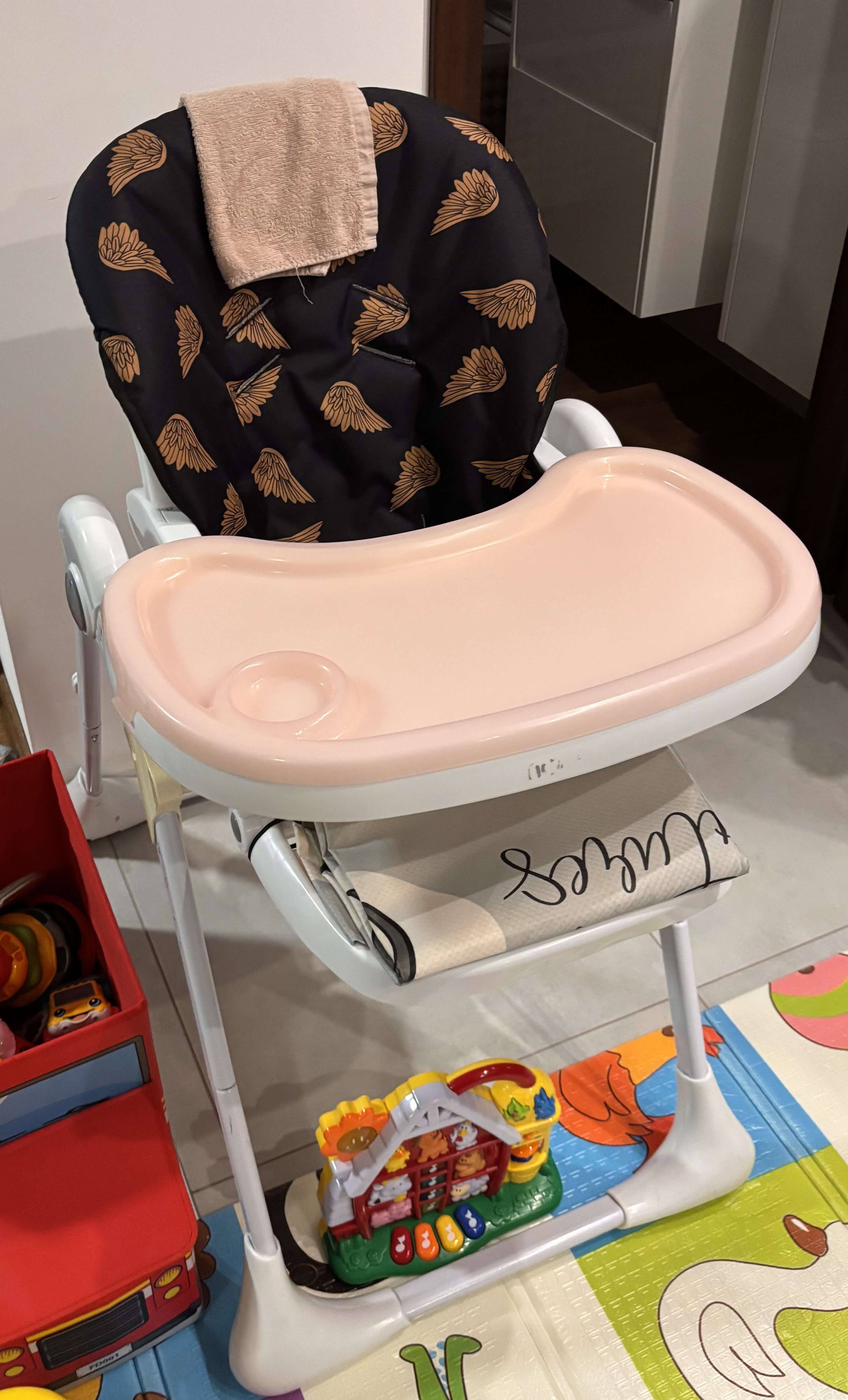 Tak tej kinderkraft yummy polecam. Można regulować jego wysokość wić dziecko może siedzieć ze wszystkimi przy stole, można regulować 3 stopniowo oparcie. Regulowany jest podnóżek. Tacka 4 poziomy regulacji. No i jak się nie używa to można złożyć na płasko. Dodatkowo można ściągać ten materiał na siedzenie i prac. To nie jest oryginalne, kupiłam na allegro i jest super bo łatwo się czyści. Tacka składa się z dwóch