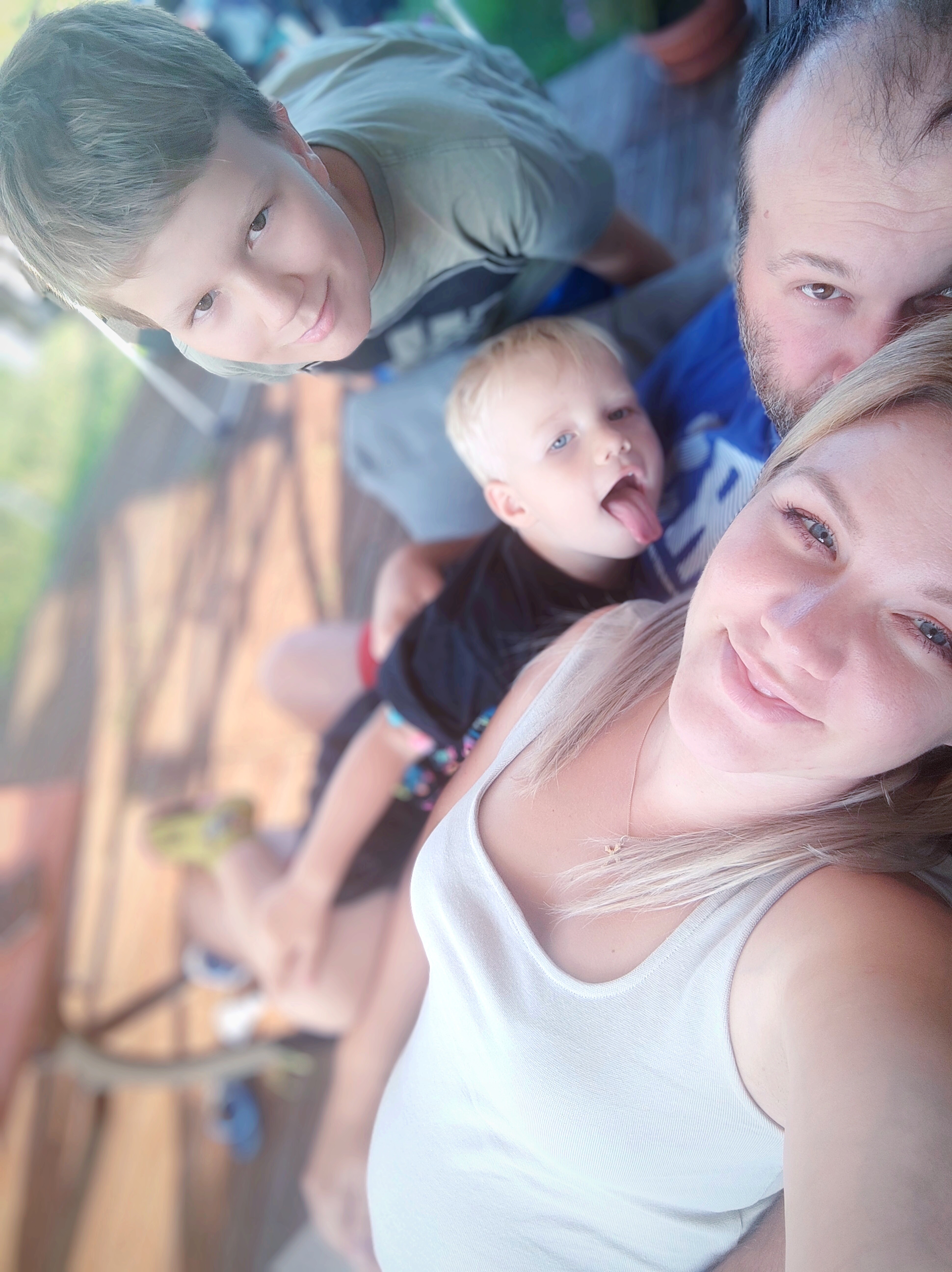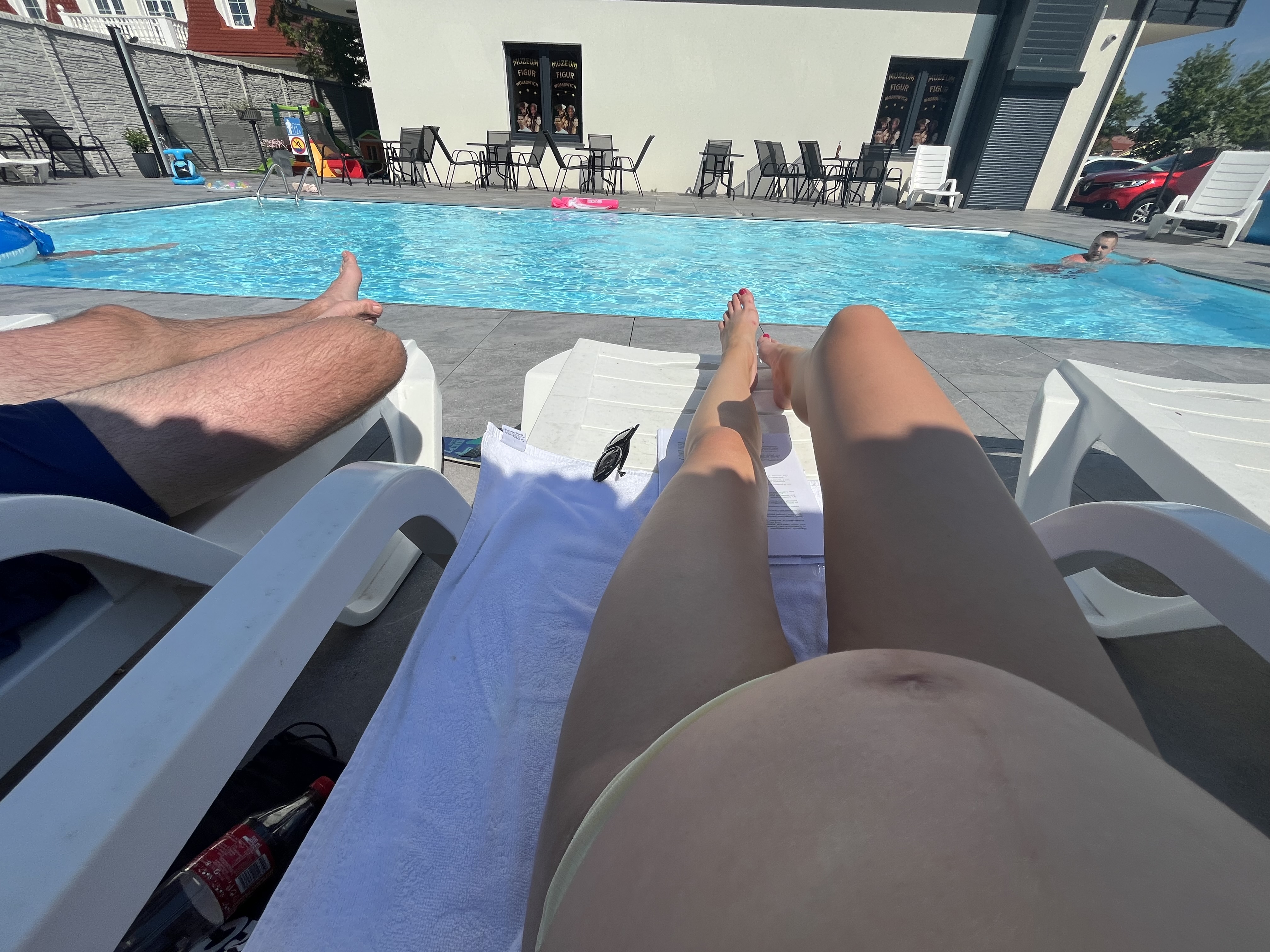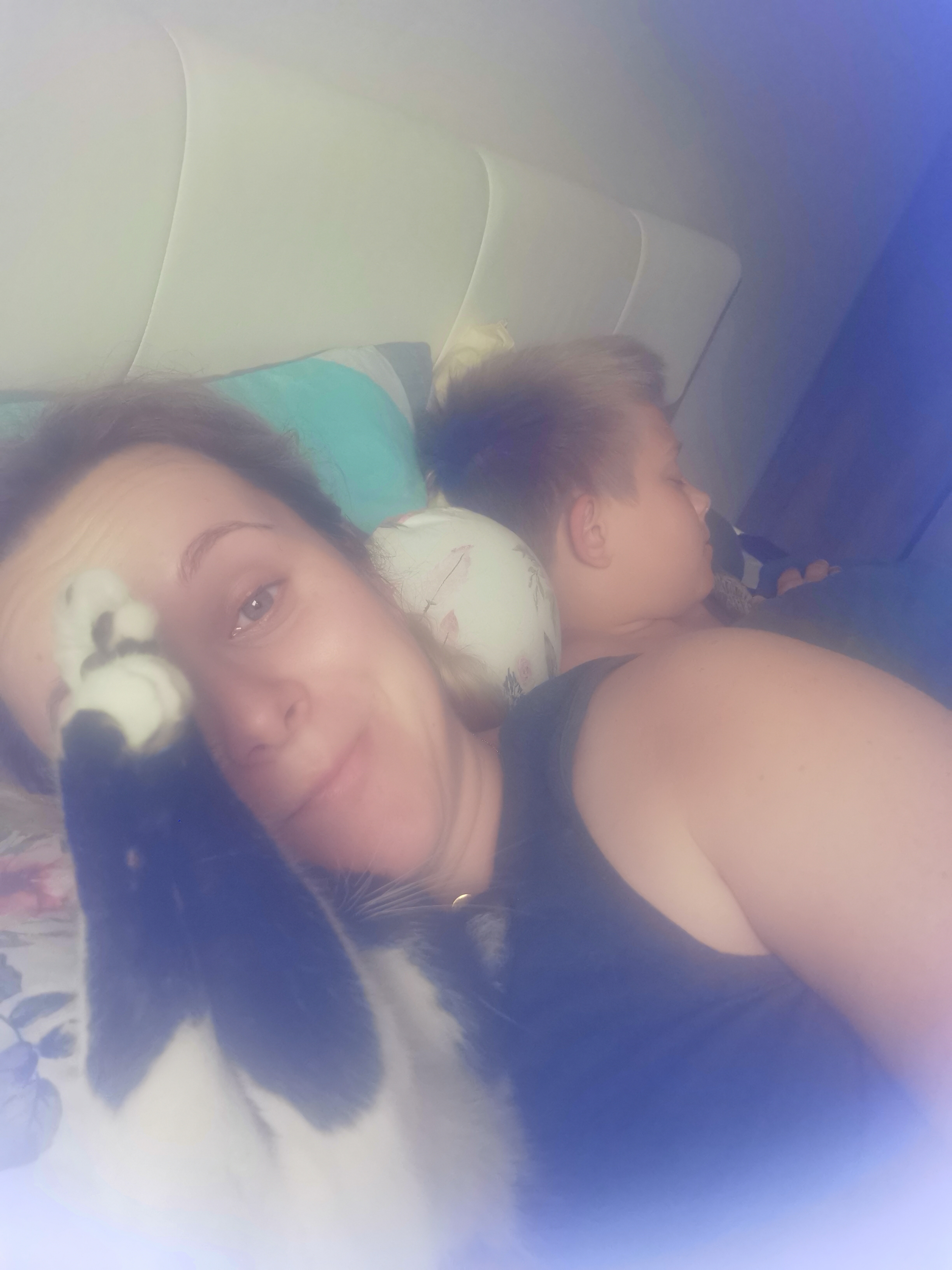 Typowa poranna pobudka wakacyjna z 10-letnim synem, 12-letnim kocurem i 8-miesieczną mademoiselle w brzuchu, który musi opierać się na wałku/poduszce, gdyż już ciężko się spi :)