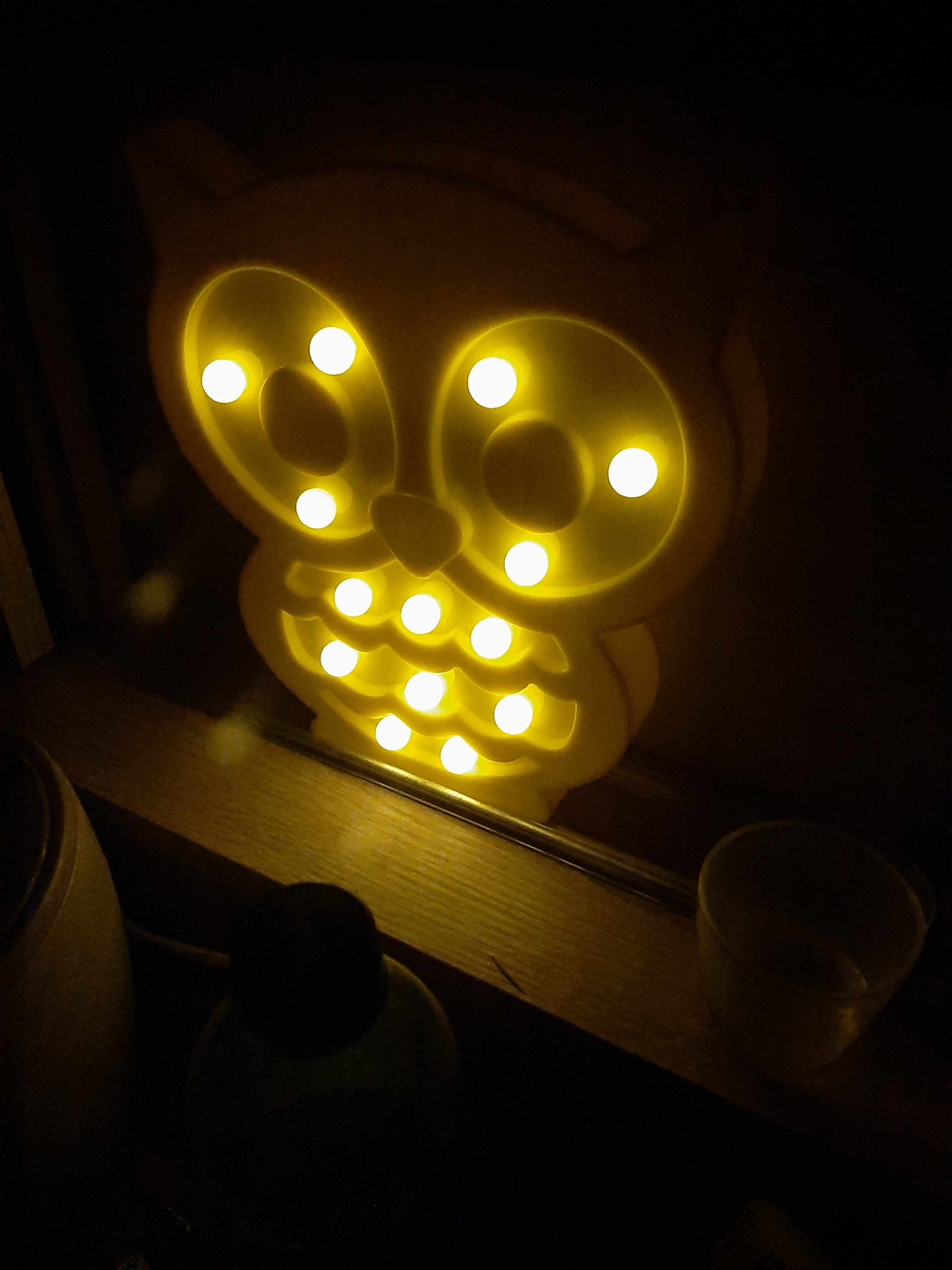 Ja mam taka ledowa sowe. Nie świeci mocno chyba że naladuje akumulatory. Wtedy pierwsza noc tylko mocno. U nas pali się całą noc.