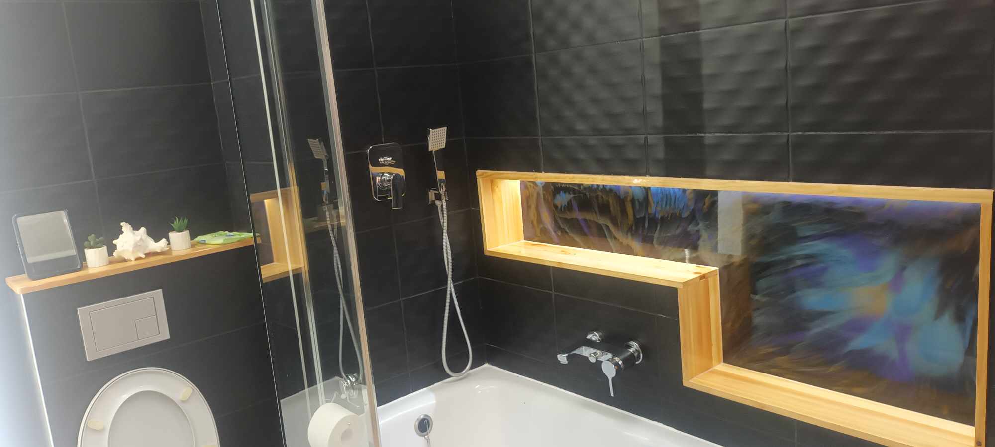 Polecam wannę z prysznicem, koniecznie podtynkowe baterie. Warto to zaplanować. Łazienka mam czarna z fakturą, więc wiadomo coś tam widać jak się chlapie i trzeba czyścić ale mam środek, który robi efekt wow! Prysznic na codzień a wanna raz na jakiś czas do relaksu. Nie widzialam innej opcji niż duet z szybą (mój sposób na czyszczenie szyby to zwykle Mydło z wodą lub płyn do mycia naczyń, spłukanie, starcie nadmiaru i wytarcie do sucha)