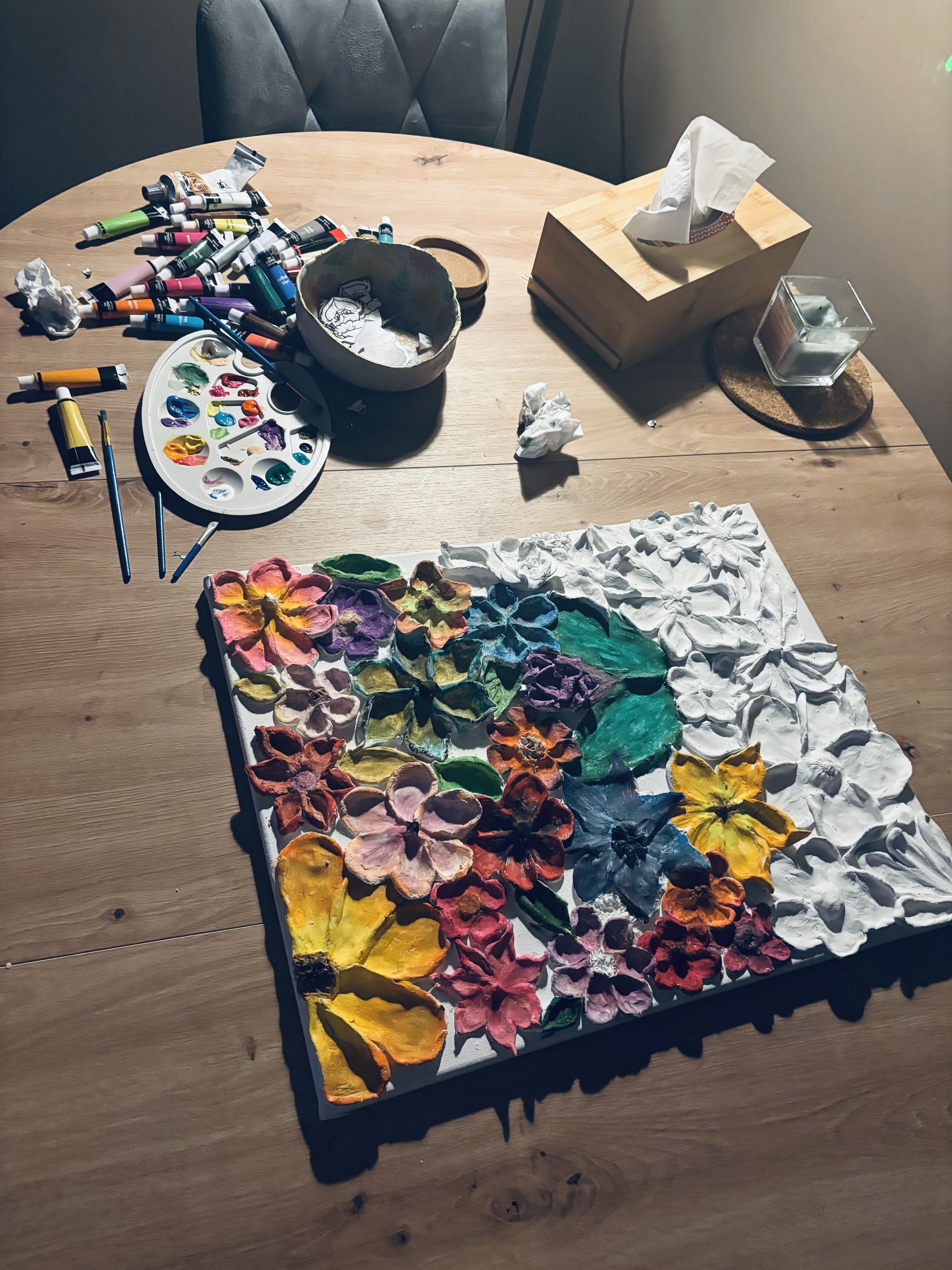 Nie miałam inspiracji , weszłam do action i kupiłam płótno a glinę miałam w domu . Jak się gorzej czuje psychicznie , mam zły dzień to sobie tak dłubie