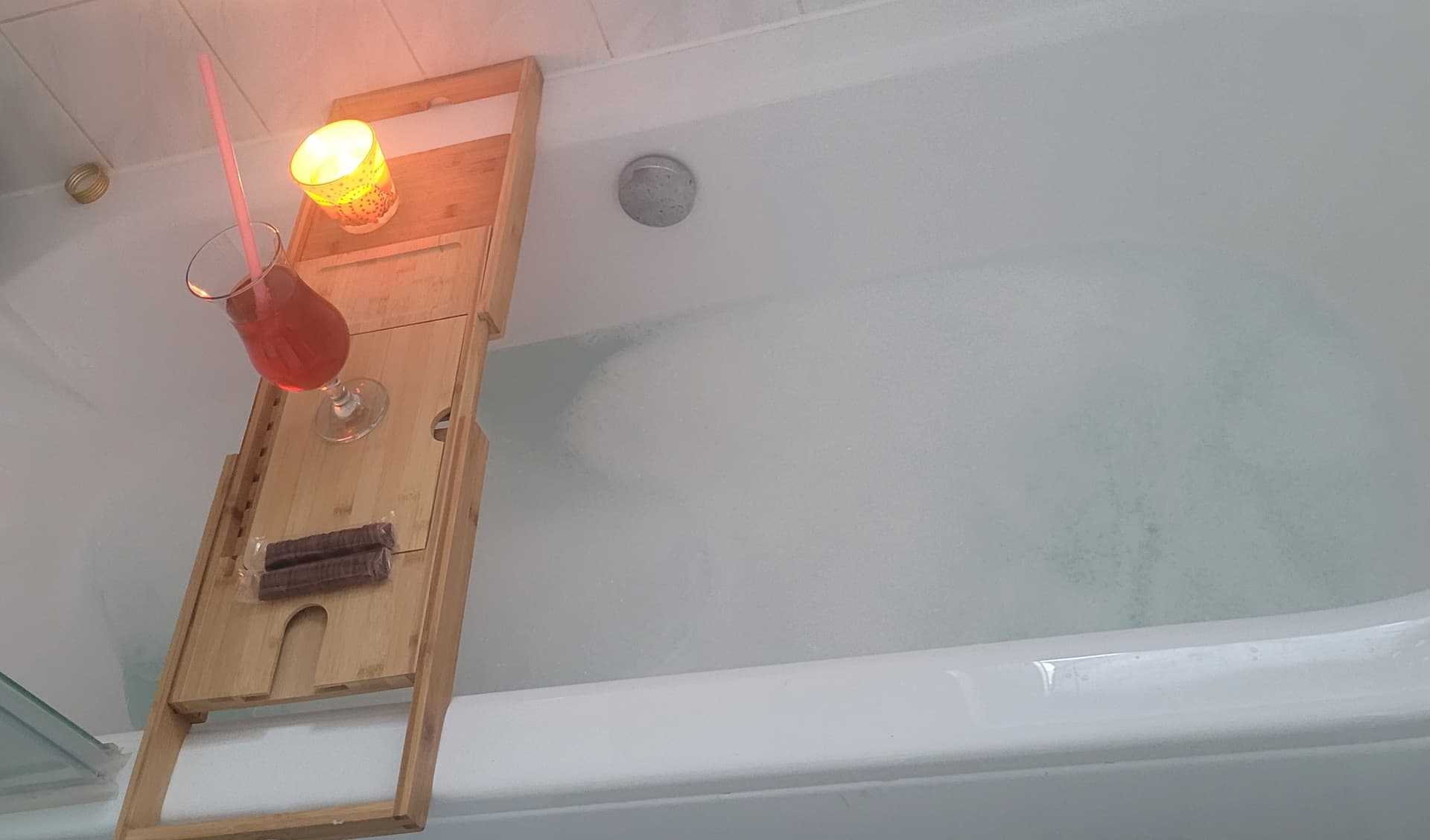 Wiec dzis z rana zrobil mi kąpiel z piana, swieczka, kinder bueno i bawaria truskawkowa 0% ![]()