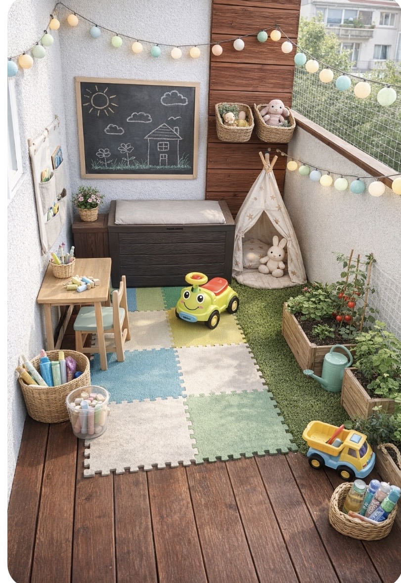 ja bym poszla w mate piankowa i skrzynie na balkonowe zabawki. Super wyglądają swietlne girlandy