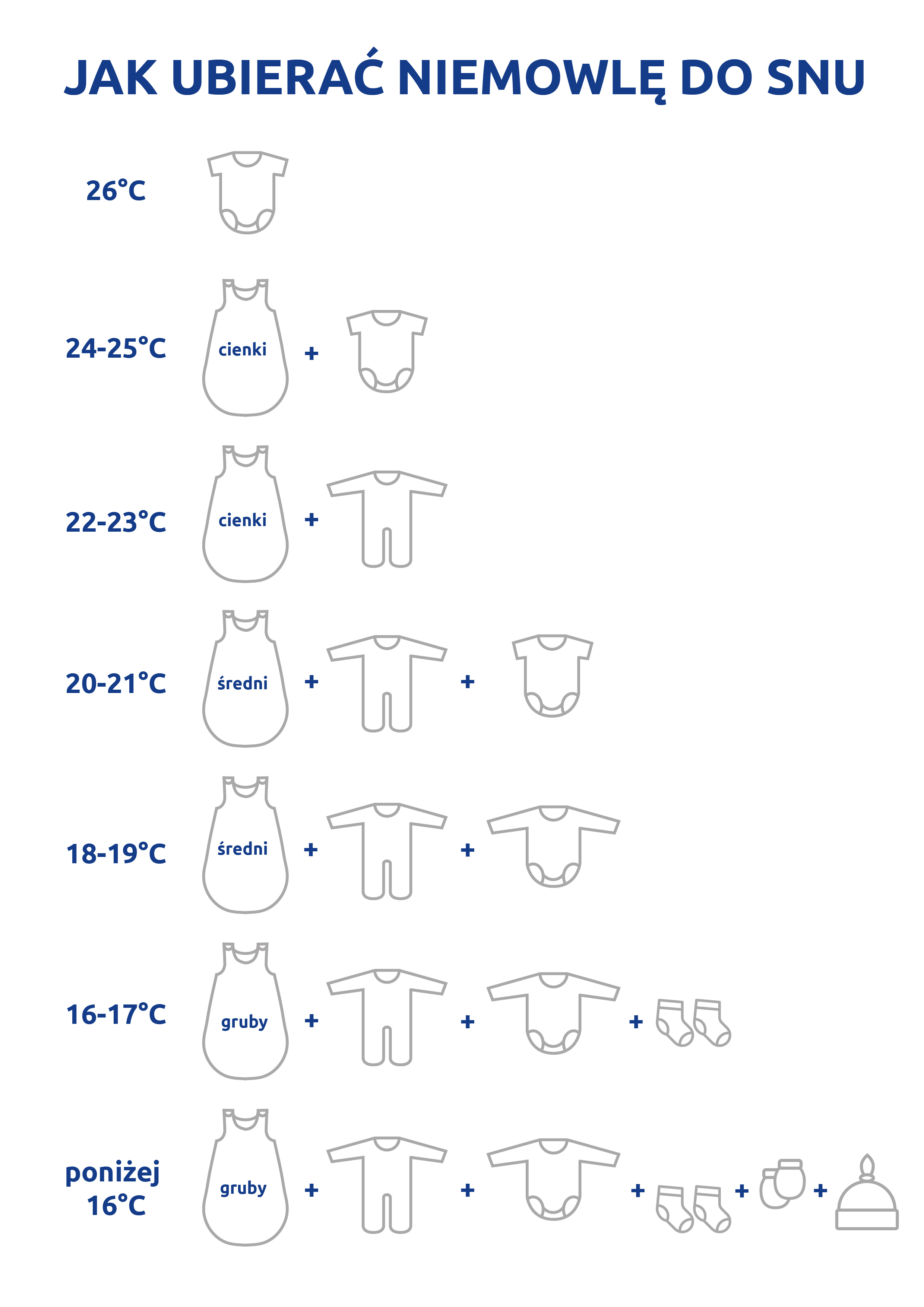 U mnie jest 20 stopni i pod śpiworek zakładam śpioszki i zazwyczaj body z długim rękawem. Synek ma problemy ze skórą więc wolę żeby nawet było mu trochę chłodniej niż go przegrzać. Ubierając synka do snu sugeruje się tą grafiką, ale raczej skupiam się na sprawdzaniu karku i pilnowaniu żeby kark był ciepły a nie przegrzany i spocony