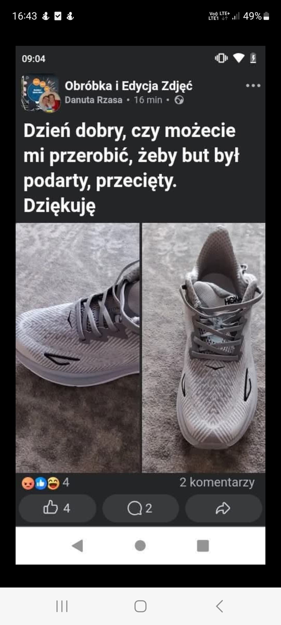 Apopos uszkodzen wygenerowanych przez sztuczna inteligencje to zobaczcie co znalazlam w necie. Babeczka chce zeby ktos jej przerobil zdjecie ze niby buty uszkodzone. W ten sposob zalozy spor na vinted i dostanie zwrot kasy. Januszostwo poziom hard bo buty pewnie za 30zl…