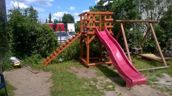 Mój mąż uwielbia “grzebać” i tak o to wziął niepotrzebne eski od brata i kolegi(aktualnie obaj się budują i nie byly potrzebne). Dokupił ślizg, kilka śrub, farbę i dziecko ma zjeżdżalnię