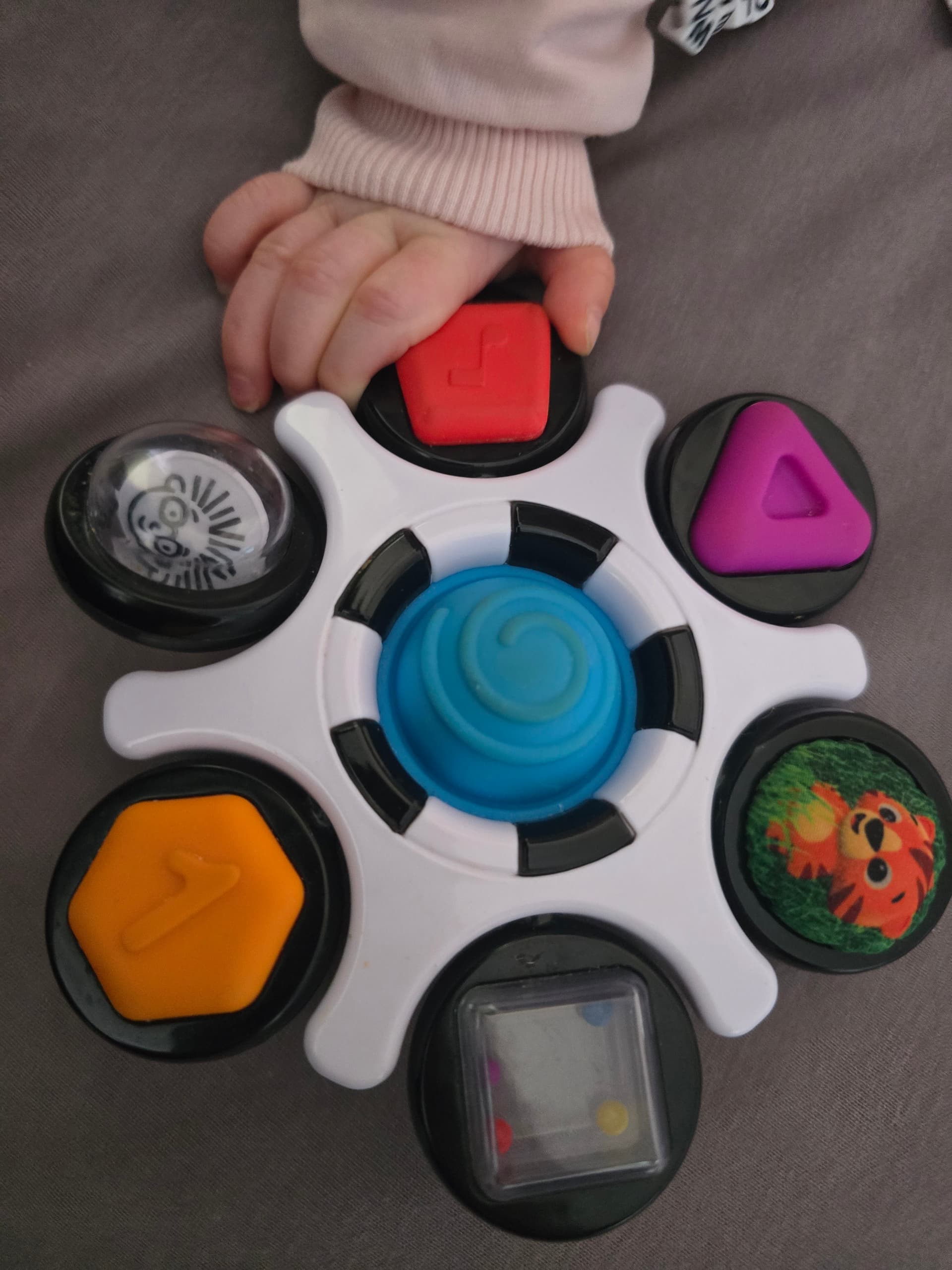 To ma przystawkę i ja to przyklejałam do szafek kuchennych i maluch sobie siadał i kręcił tym …. Teraz już nie przyklejam tam bo się nicpoń nauczył za jego pomocą otwierać szafkę