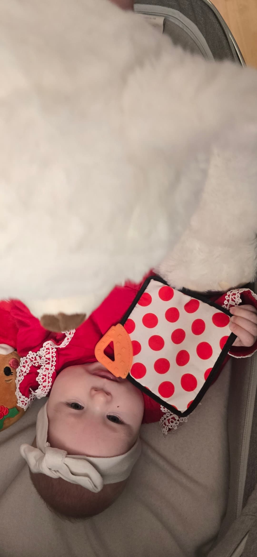 Balon z helem super sie sprawdzil . Nie wiem dlaczego , ale zupelnie zapomnialam o kartach sensorycznych . U nas byli z Canpol i to byla zabawka top top bardzo dlugi czas . Na 1 stronie maja gryzaczek i szeleszczą . Nawet jak.gdzies na szybko wychodzilam to wkladalam taka 1 karte do kieszeni , bo sa bardzo fajnych rozmiarow