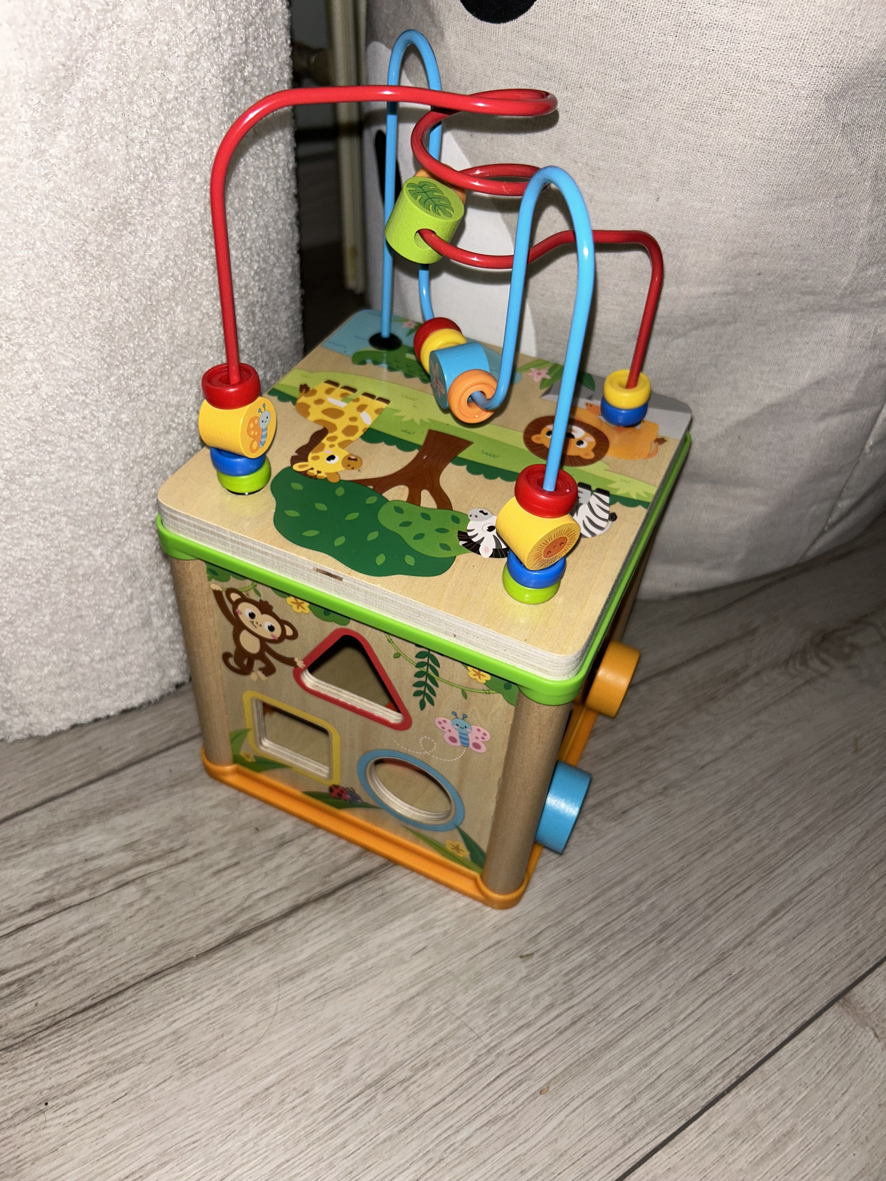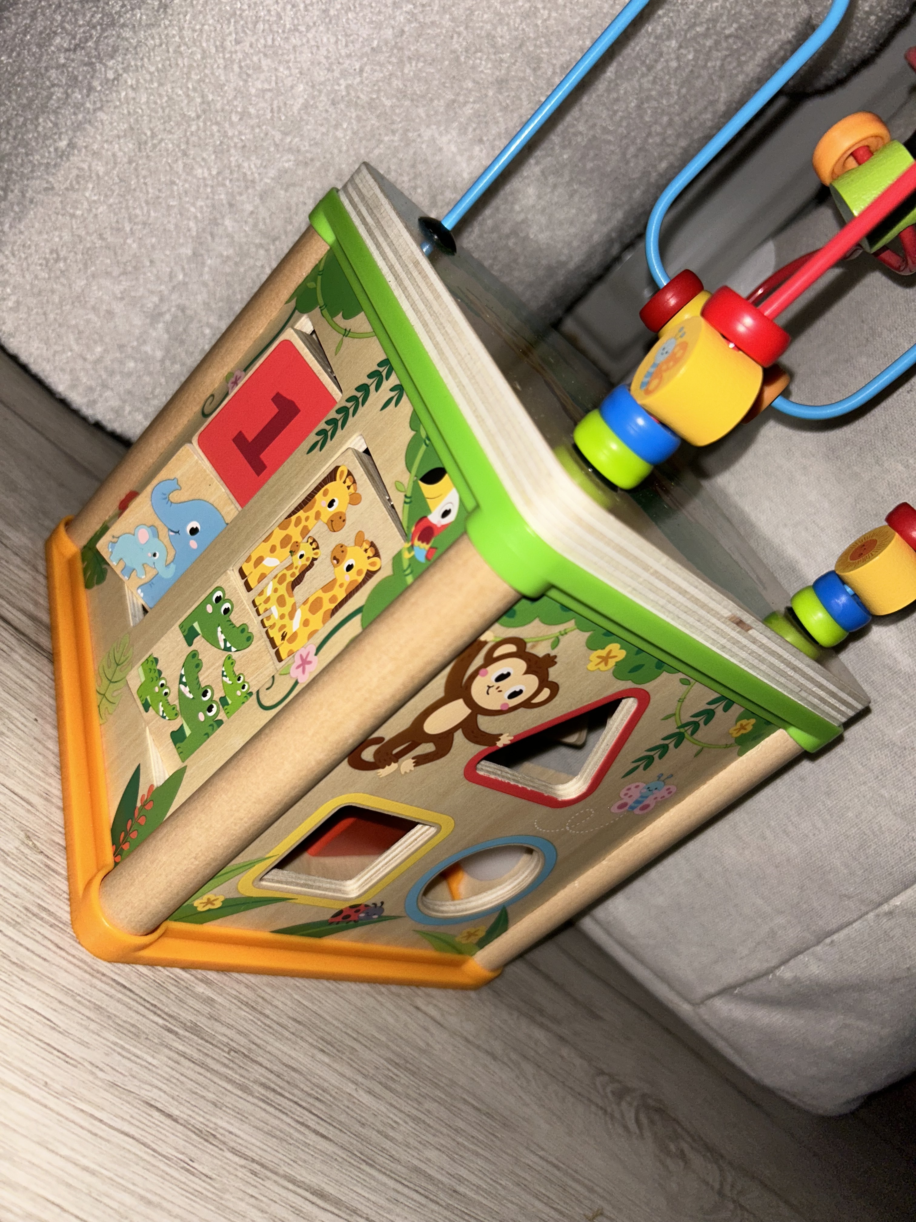 aczkolwiek teraz jest strzałem w 10, bo nasza córka zaczyna właśnie zauważać, że może coś pchnąć, i to się zakręci, sortera jeszcze nie ogarnia, więc jak zacznie, to tu też jest sorter na 3 kształty. O wiele bardziej wolę takie zabawki, manipulacyjne, sensoryczne, niż np kolejnego pluszaka
