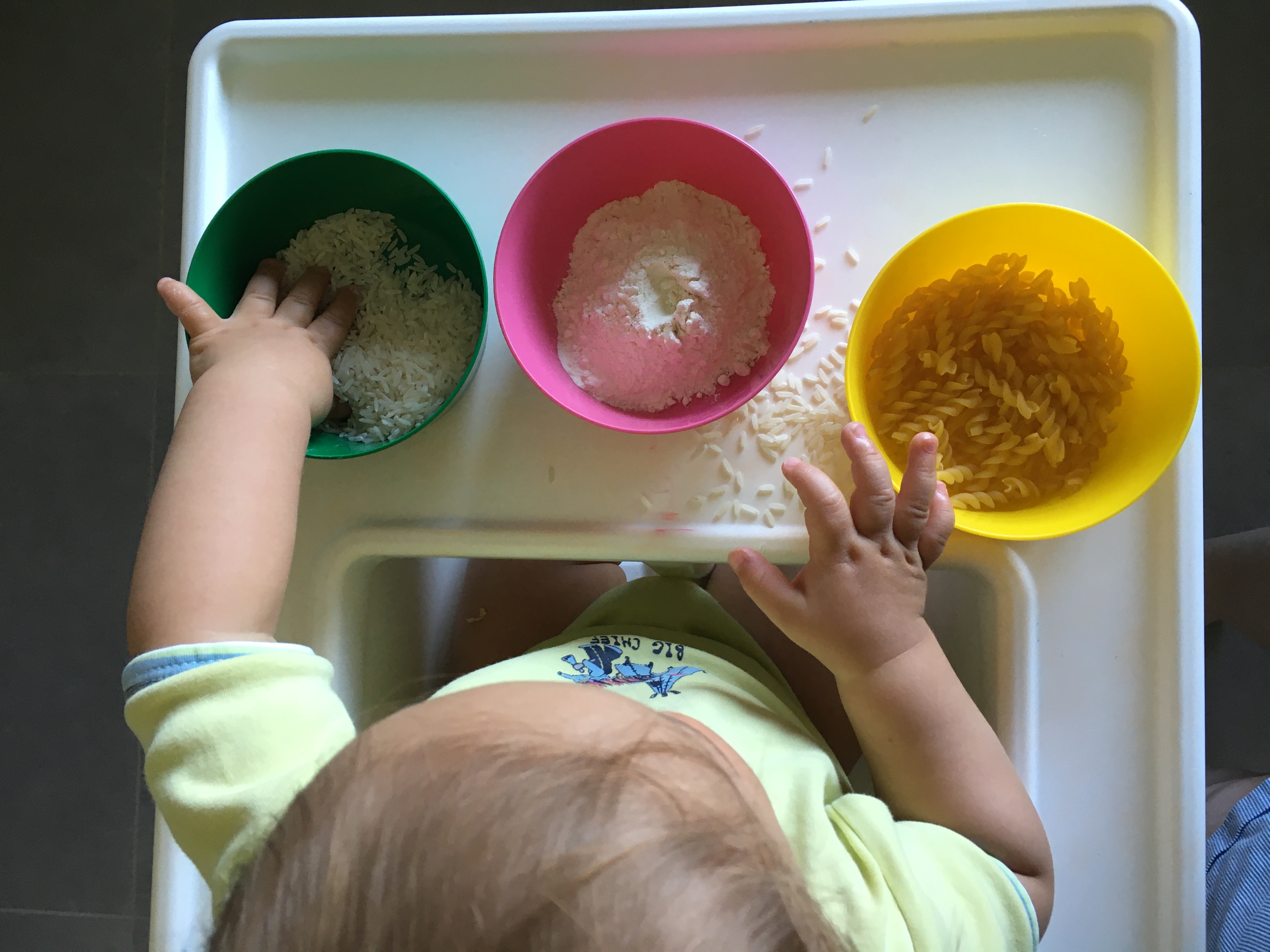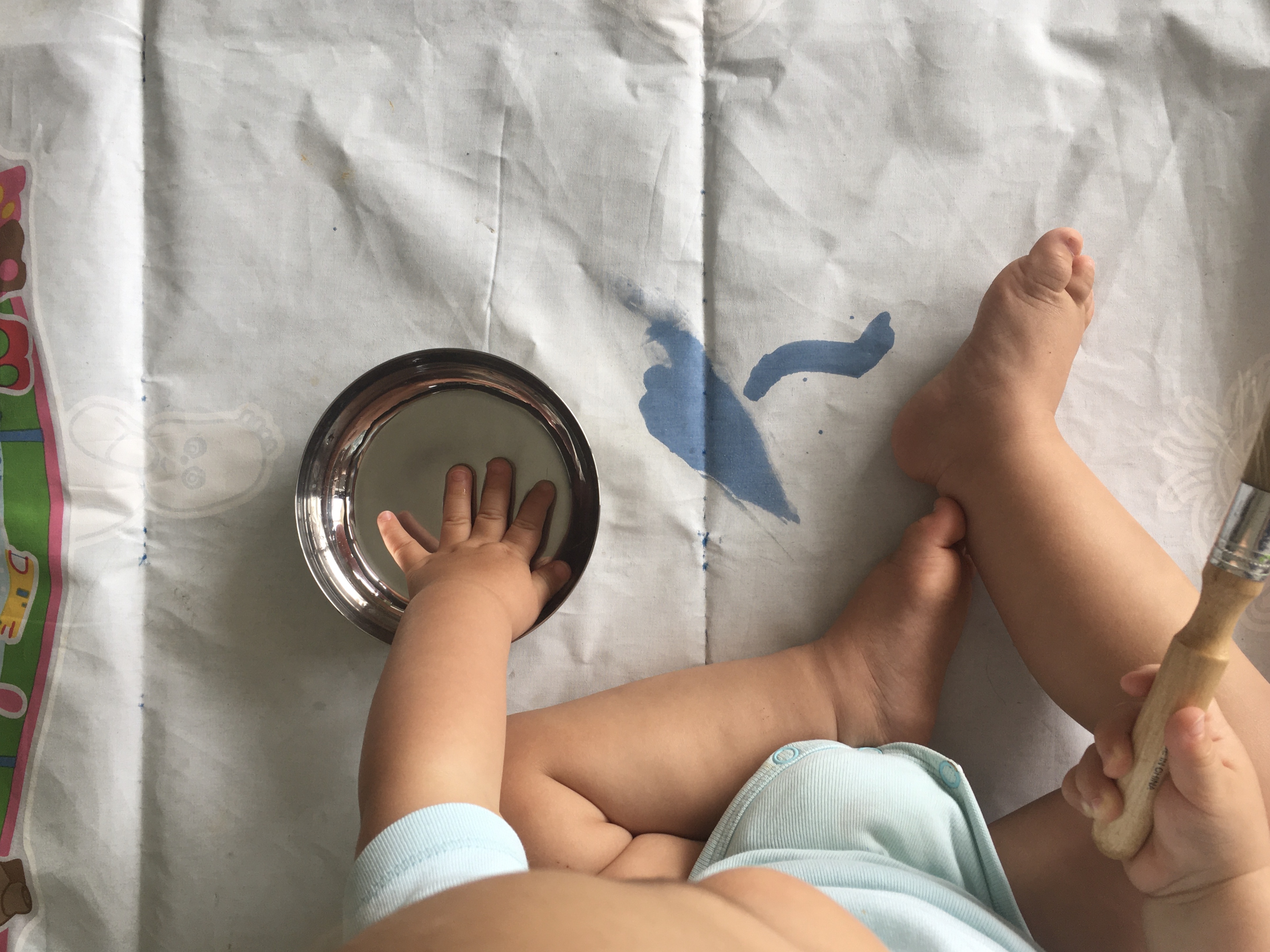 W domu do kreatywnych zabaw zaliczam malowanie palcami, wydzieranki, zabawy wstążkami (młody lubi je rozwijać i zwijać), gotowanie, zabawy z woda.
