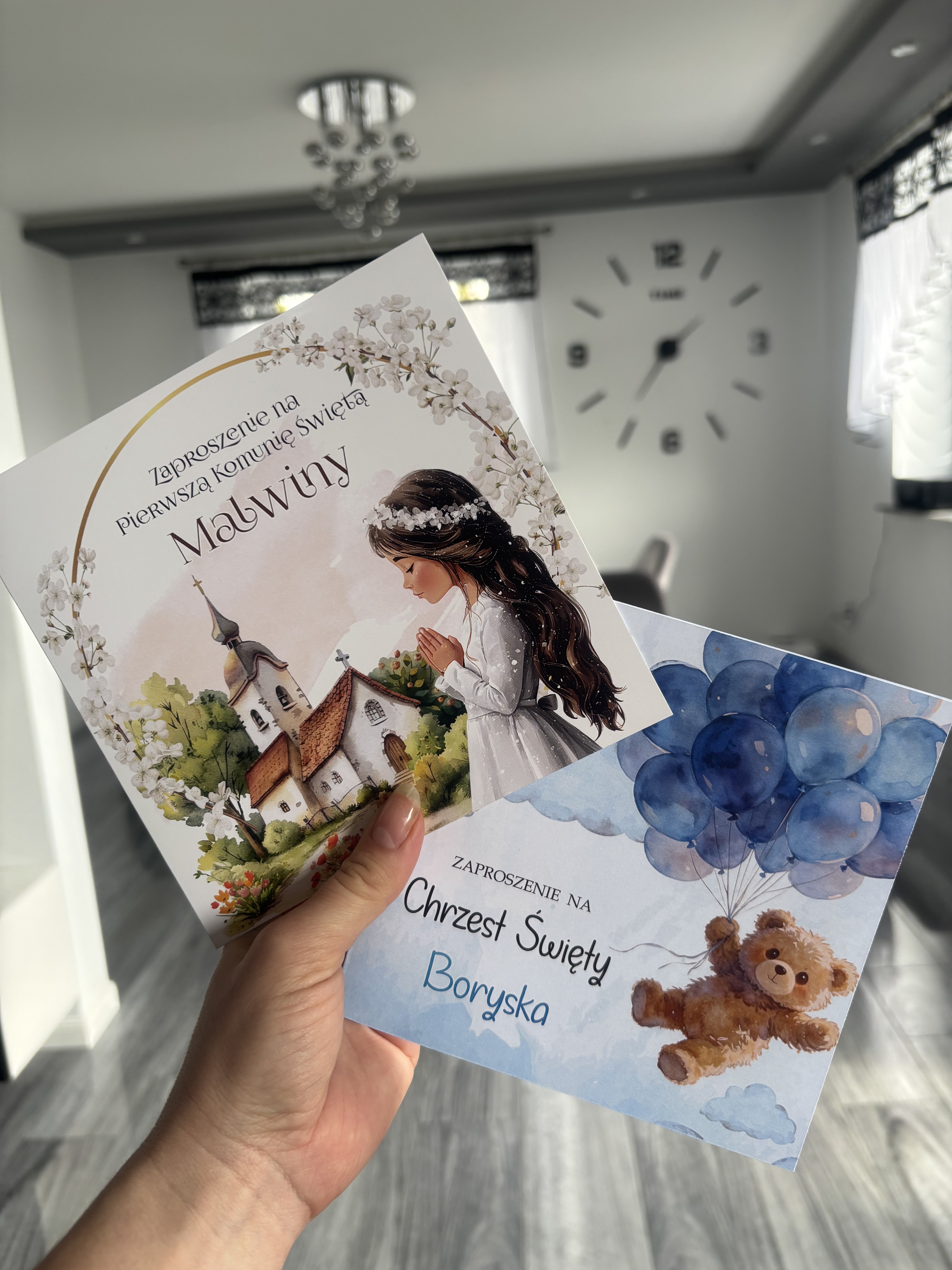 Hej jeśli chodzi o zaproszenia można samemu stworzyć w Canvie i wydrukować na ładym papierze. Zaproszenie dla chrzestnych jeśli chodzi o chrzest napewno drewniane. Komunie tak jak wszyscy stworzoną samodzielnie.