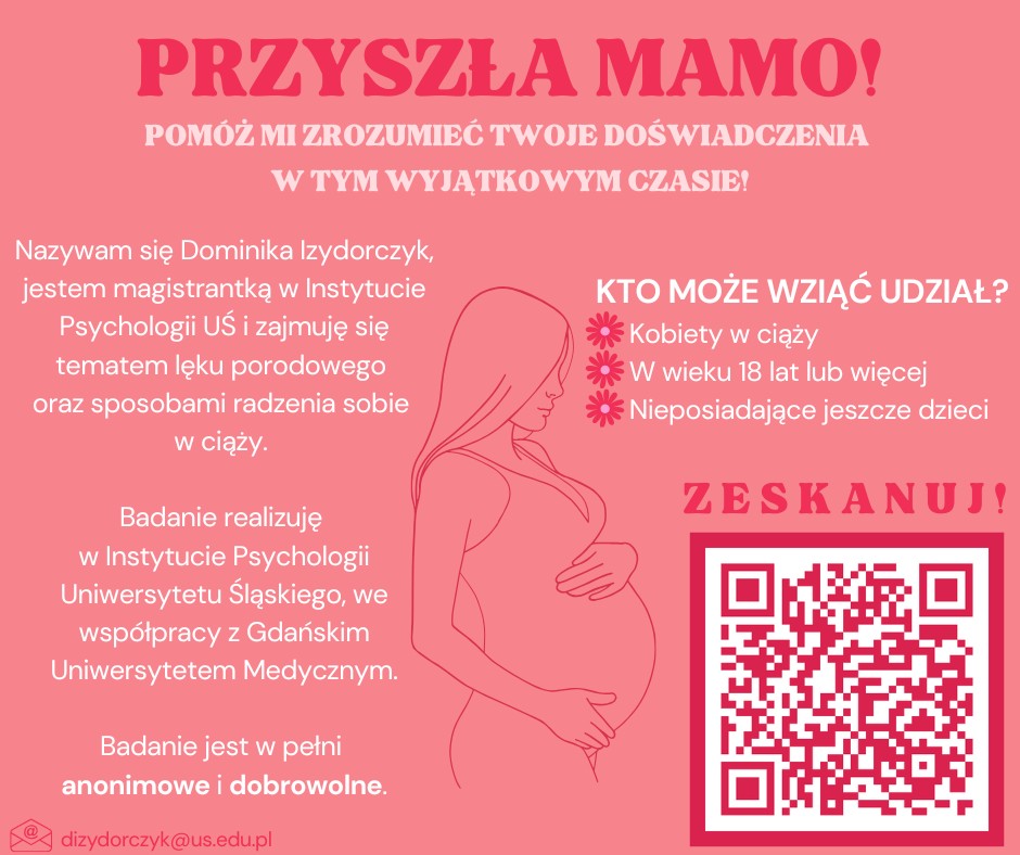 Chciałabym bardzo serdecznie zaprosić Przyszłe Mamy do udziału w badaniu, które realizuję w ramach pracy magisterskiej. Moim celem jest lepsze zrozumienie zasobów psychologicznych kobiet w ciąży i ich związku z lękiem przed porodem.