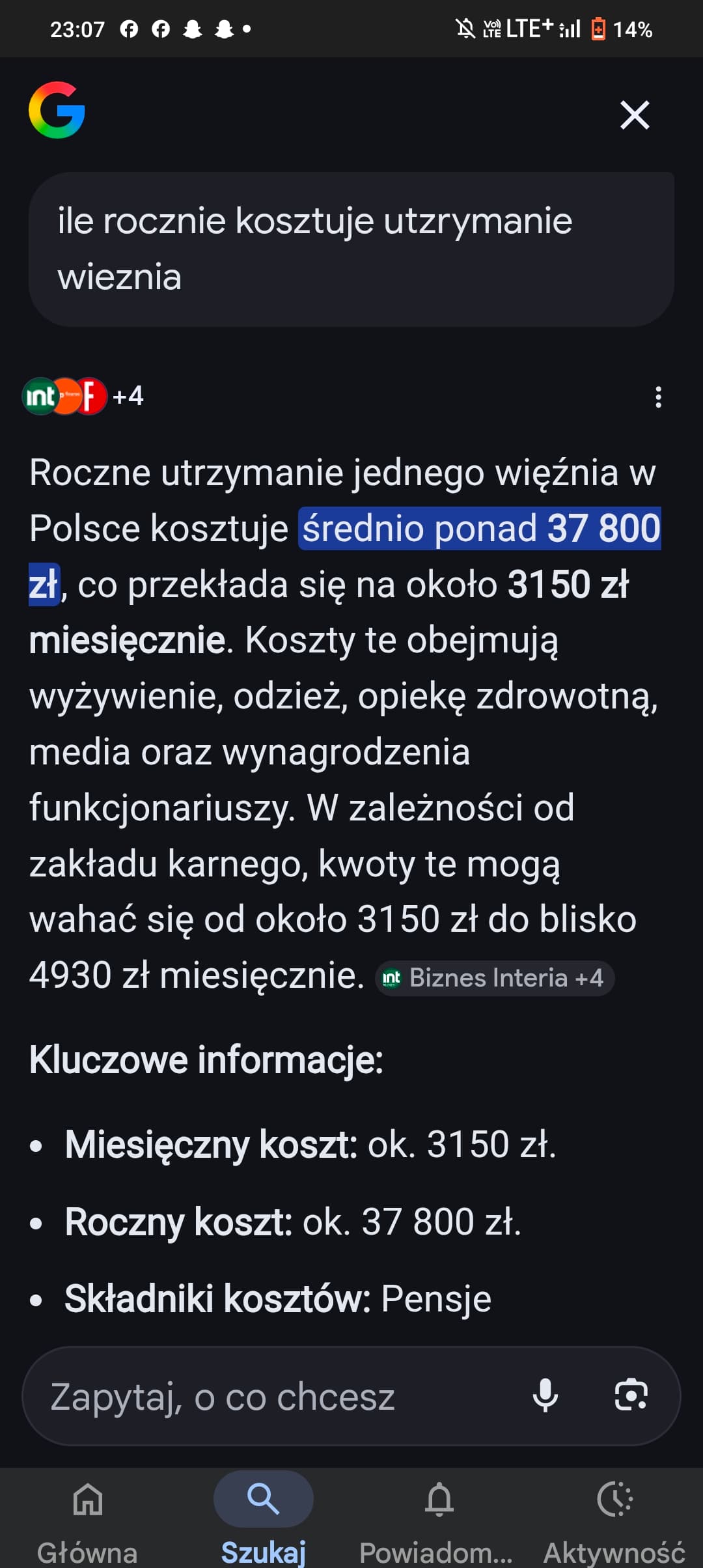 gdzies kiedys widzialam ile kosztuje utrzymanie roczne wieznia i to bez sensu , ze sobie tam siedza w cieplym z posilkami i nie musza nic …